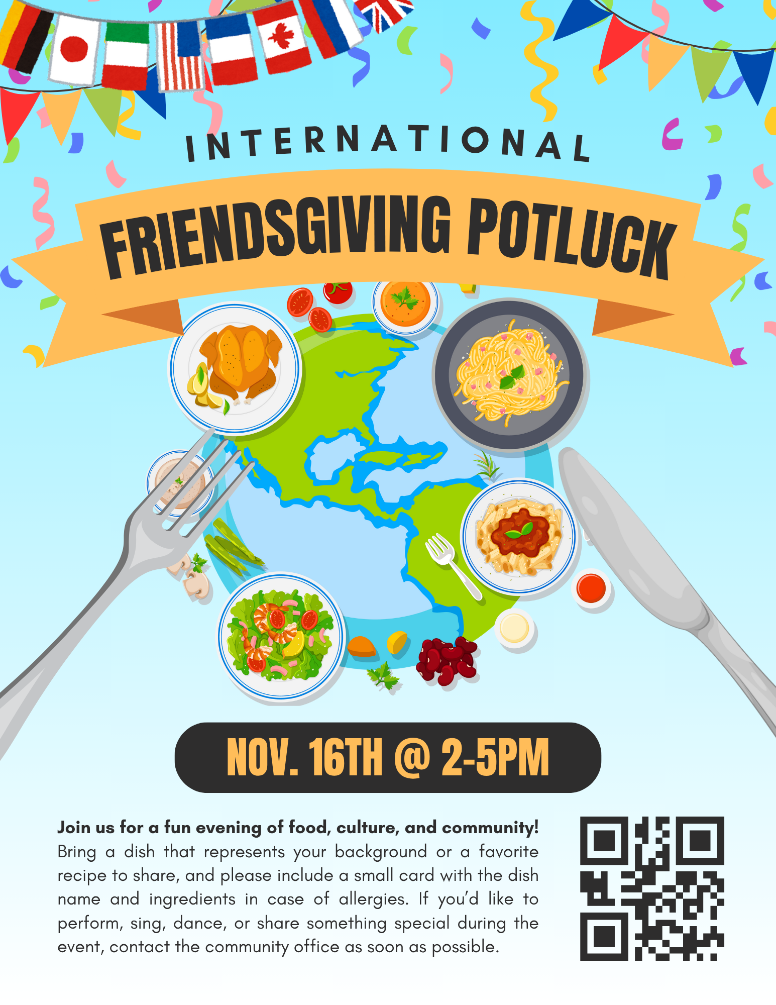 International Friendsgiving Potluck + Add to Google Calendar + iCal / Outlook export Date Nov 16 2025 Expired! Time 2:00 pm - 5:00 pm Category Family Events Indoor Sports Court Share this event